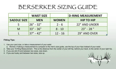 El arnés Berserker está diseñado para sesiones de caza de día completo y movimientos sin esfuerzo en el árbol. Un asiento ajustable de panel único, presillas de liniero de gran tamaño y un sistema de puente totalmente ajustable permiten un ajuste preciso en cualquier escenario de caza.