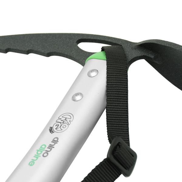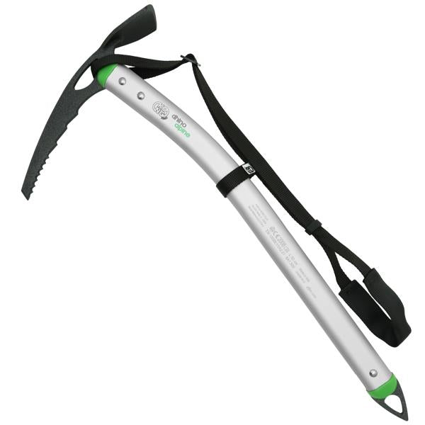 Technical mountaineering ice axe. Light alu alloy bent body, zinc plated steel peak and spike. Dragonne made with sling to make it unmissable. Available in three sizes (50, 55 and 60 cm).