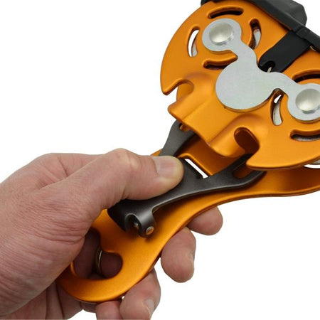 Evolution of the first pulley with an integrated connector which eliminates any possibility of error. Improved handle ergonomics and simplicity of use thanks to the new lever which can be opened with one hand. The special design ensures correct positioning on the rope in any situation. Equipped with ball bearings for perfect smooth rolling.