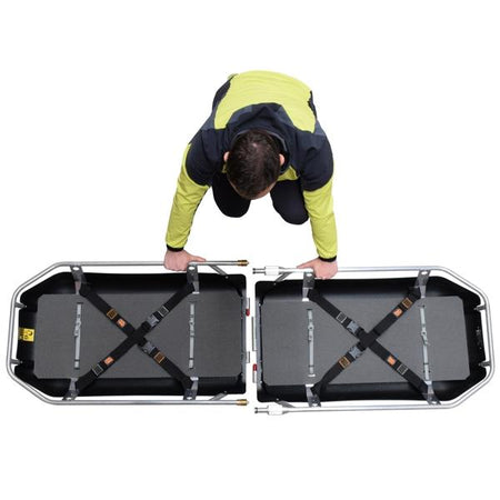 Extremely lightweight shell stretcher that can be disassembled into two parts for easy transport, equipped with internal padding and fastening straps.