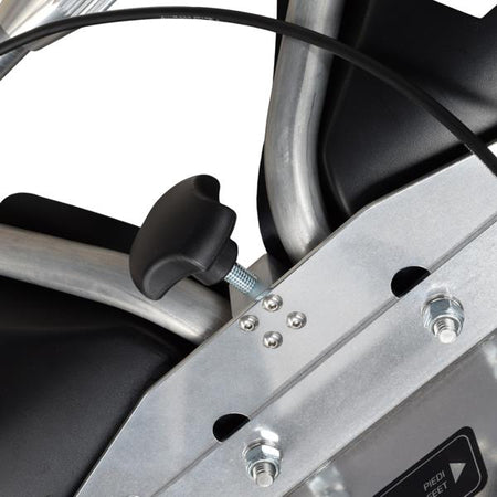 The wheel, equipped with a wide and knobby tyre, allows operation on uneven terrain, helping stability and offering good puncture resistance.
