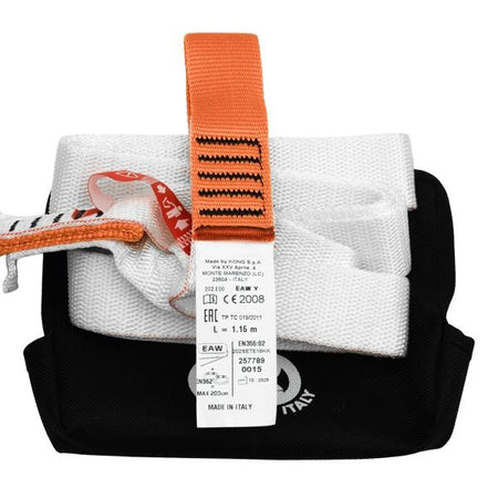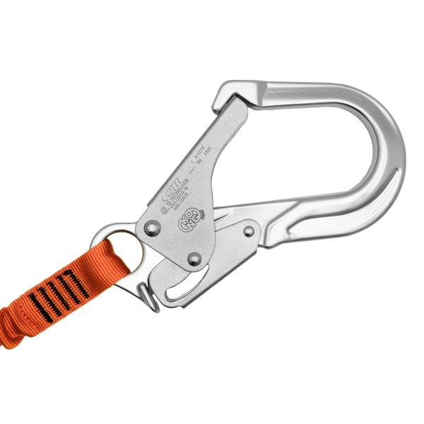 The energy of the fall is absorbed by the tearing of specific webbing. Mesh pouch with velcro protects the energy absorber from abrasion and allows regular verification of the absorber's condition with stress indicator.